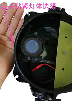 4.用右手掌托着风扇底部位置,左手贴紧灯体边缘,然后慢慢的把图案片倒出来