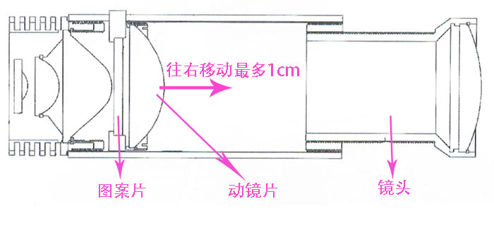 2. 逆时针扭脱调灯筒(即镜头),然后用锥子对准动镜片边缘的小凹槽,顺时针旋转往图案片靠近时光斑变小;逆时针旋转离图案片远时(最多能移动1cm的距离)光斑变大。